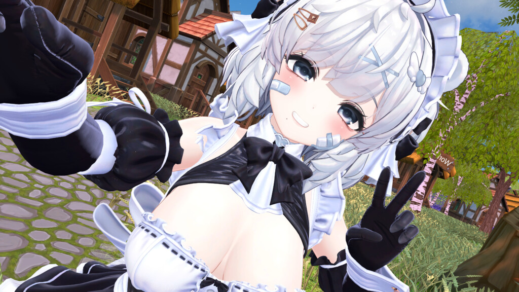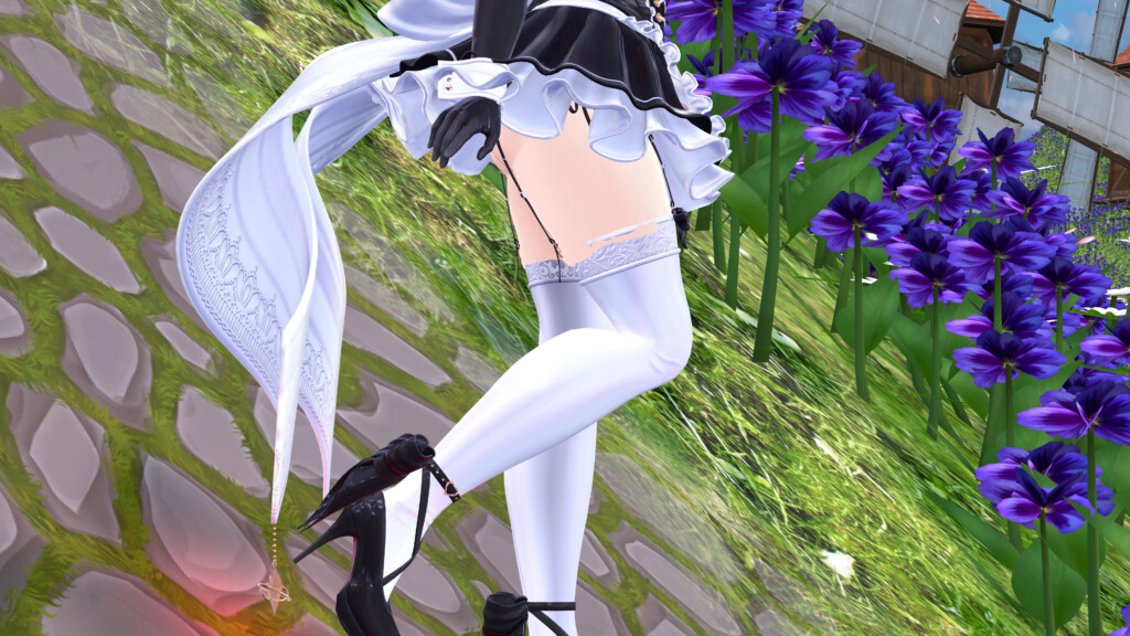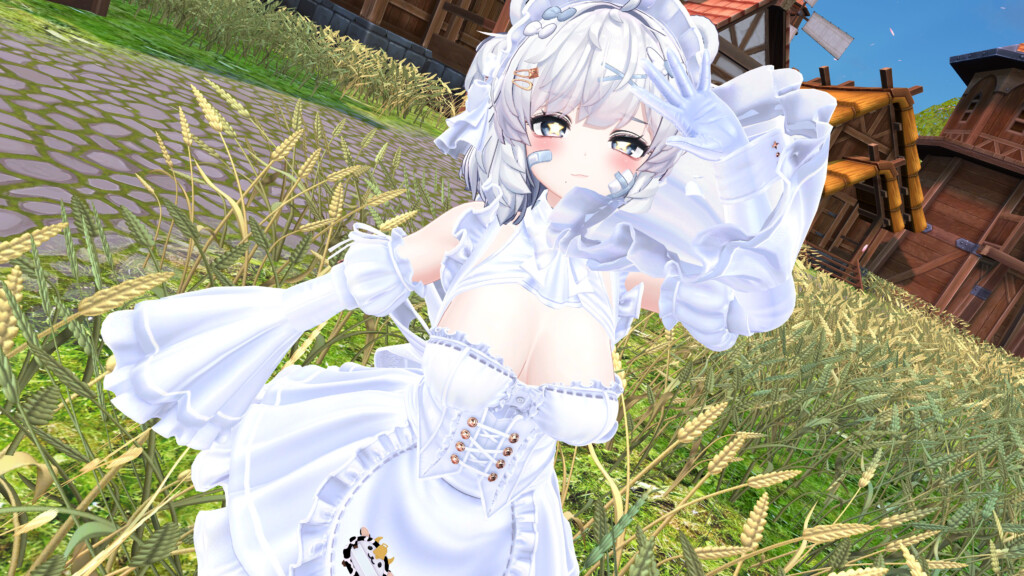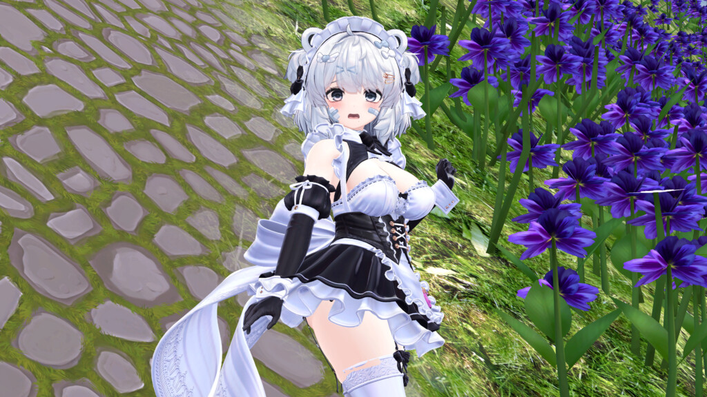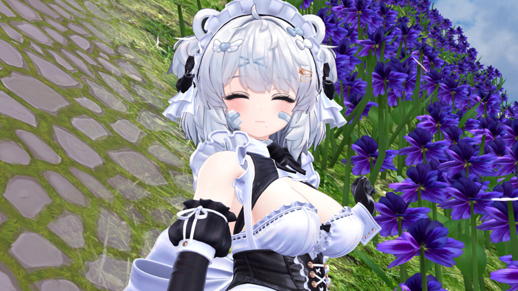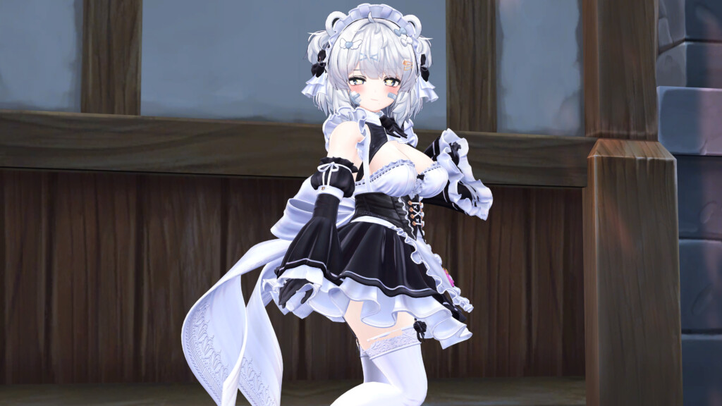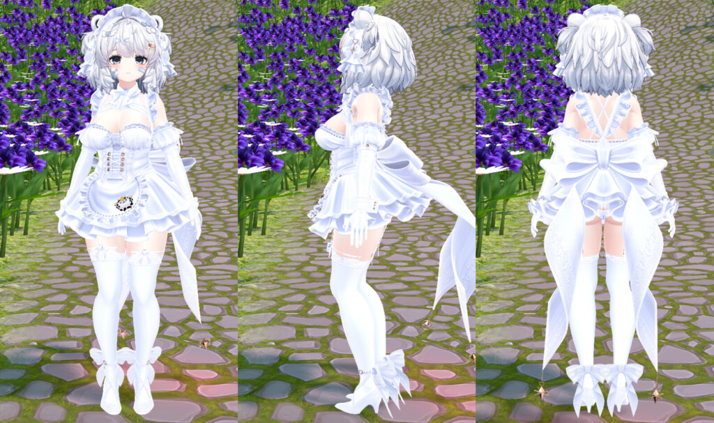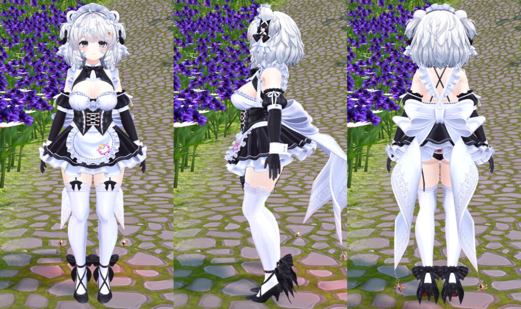 VRChat内で着用してみると、全体のシルエットバランスの良さが際立ちます。作り込まれたデザインは、単なる「可愛いメイド」に留まらない気品と妖艶さを醸し出し、数多の衣装が存在するVRChat世界でも抜群の存在感を放ちます。