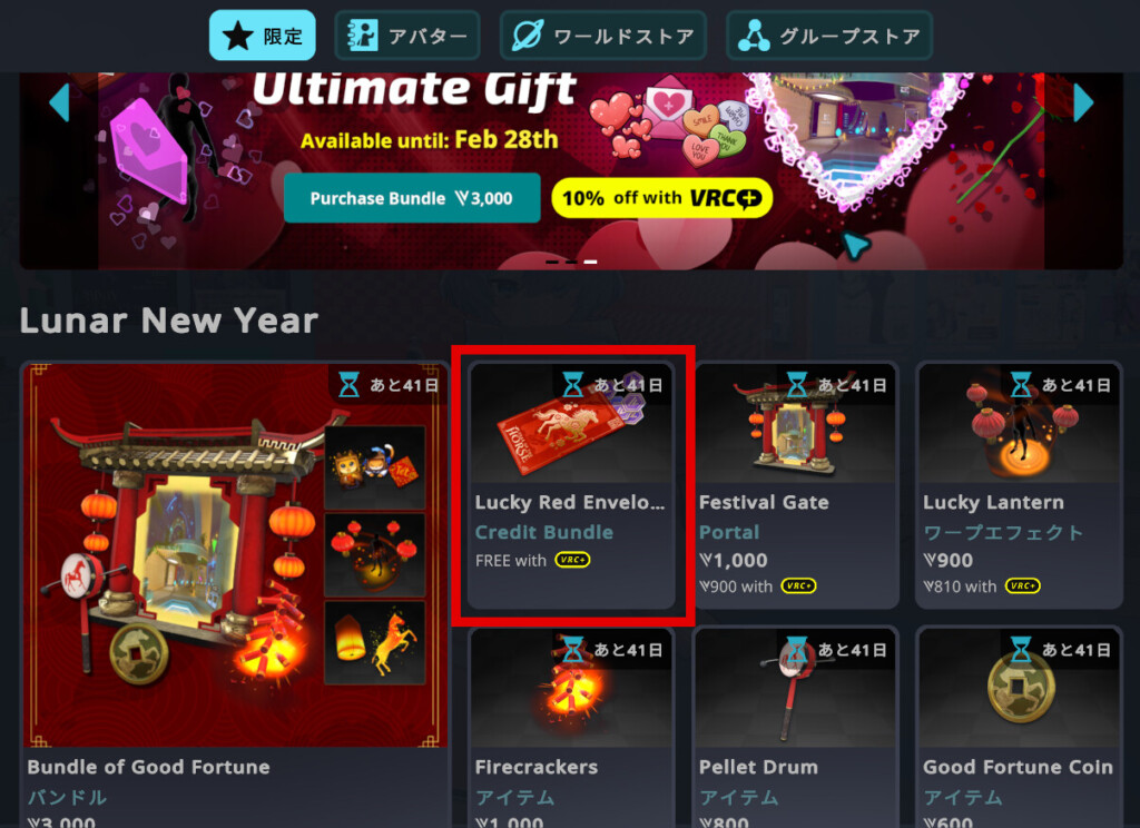 VRChat社が2月の春節(旧正月)を記念して、VRC+に加入しているユーザーに対し期間限定で400クレジットの無料プレゼントを行っています。あわせて公式のショップでも春節を記念したアイテムも販売されています。