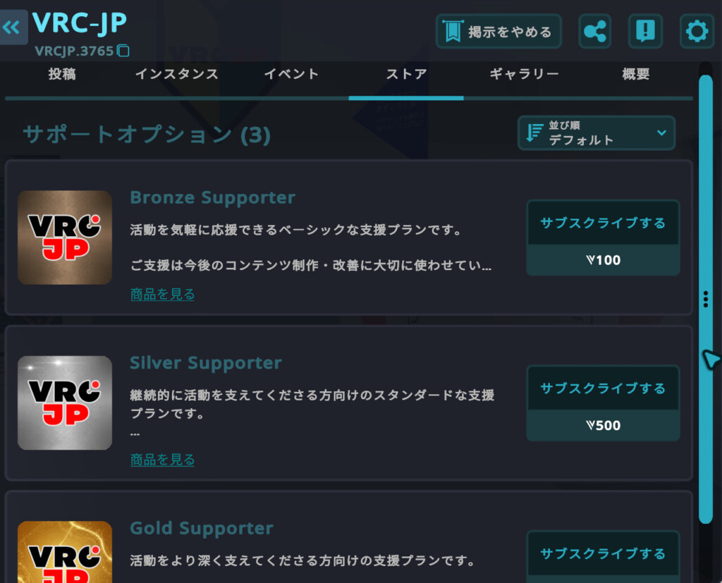 たとえば、Visitor、NewUserなど初心者向けの遊び方を紹介し、色々な交流イベントも定期的に開催されるワールド「VRC-JP 初心者プラザ」の公式のグループでは、100クレジットで支援ができるプランなどがあり、VRChatの公式Webサイトからでも確認ができるようになっています。