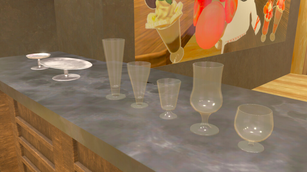 まずはパフェに使う食器を決めましょう。使える食器はこちらの7種類。オーソドックスな逆円錐のグラスもあれば、グラスの底が丸くなっている昭和レトロを感じさせるグラスもあります。