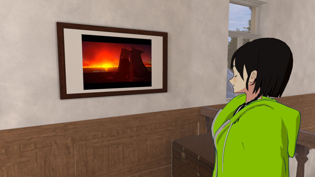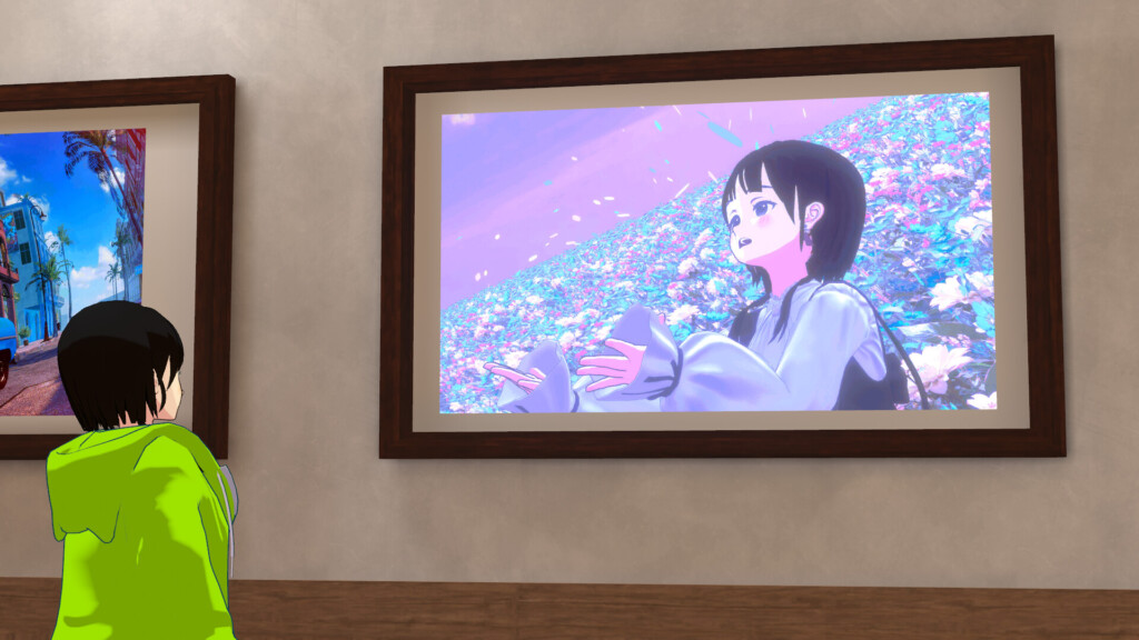 1階だと富士フイルムさんのイベントにも提出した写真ですね。これですね……自分が初めてうまく撮れたなって感じた写真なんですよ。当時は言語化できなかったのですが、風や空気感を感じて、花びらが右から左に流れる感じでドラマチックです。富士フィルムさんのイベントに提出した時のコメントがあって改めてVRCで写真を撮るのが楽しいと感じたお気に入りの写真です。
