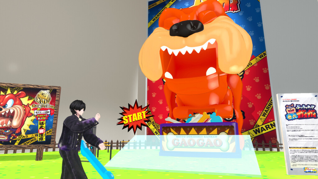 VR向けに超巨大となった番犬ガオガオ。取材での説明によると、実際のものに比べて高さが56倍、質量にして約12000倍と、噛まれたらもう終わりのスケールです。番犬ガオガオは、アバターやワールドギミックとして使えるものが販売されます。